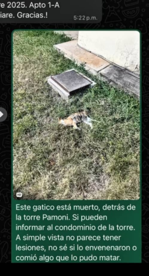 El incidente se suma a un caso anterior ocurrido en el sector Patarata y ha encendido las alarmas en la comunidad. Rodríguez relató que el calvario de Nevada comenzó cerca de las 5:30 p.m. en el parque de grama ubicado detrás de la Torre Pamoni. La mascota se desesperó al oler algo en el pasto, y minutos después, el periodista descubrió en el lugar el cadáver de un gato que, aparentemente no presentaba signos de ataque físico, sugiriendo un posible envenenamiento.