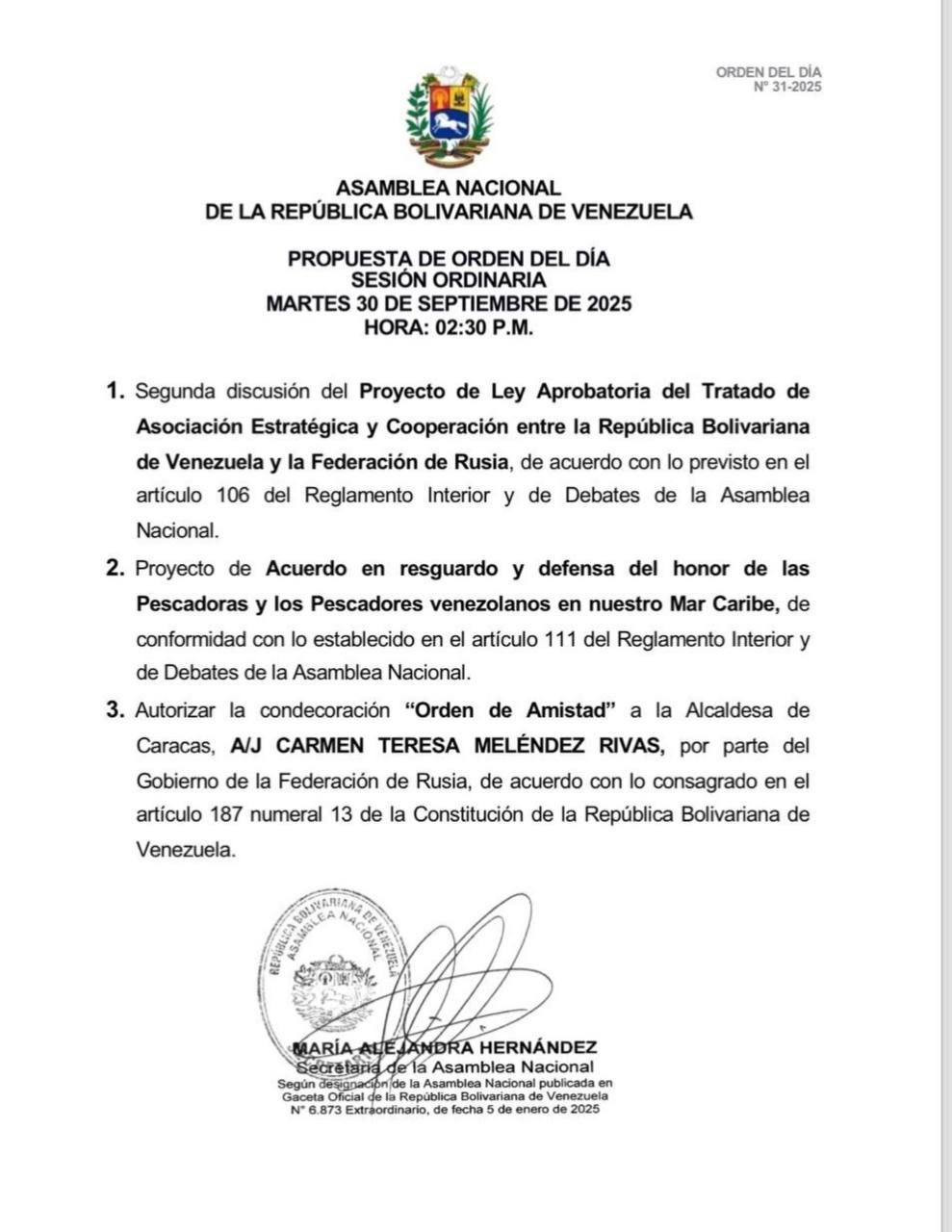 En la plenaria también tendrá lugar la segunda discusión del Proyecto de Ley Aprobatoria del Tratado de Asociación Estratégica y Cooperación entre Venezuela y Rusia.
