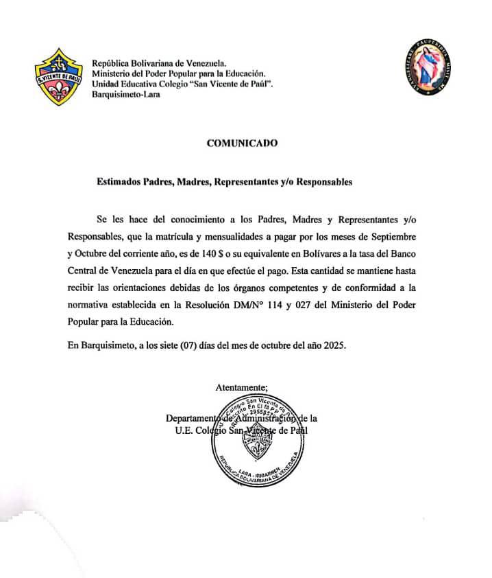 Tras semanas de intensas denuncias por el presunto aumento excesivo en el costo de la matrícula y la solicitud de intervención de la Superintendencia Nacional para la Defensa de los Derechos Socioeconómicos (SUNDDE), la directiva del Colegio San Vicente de Paúl de Barquisimeto emitió un comunicado oficial anunciando un ajuste temporal en la tarifa escolar.