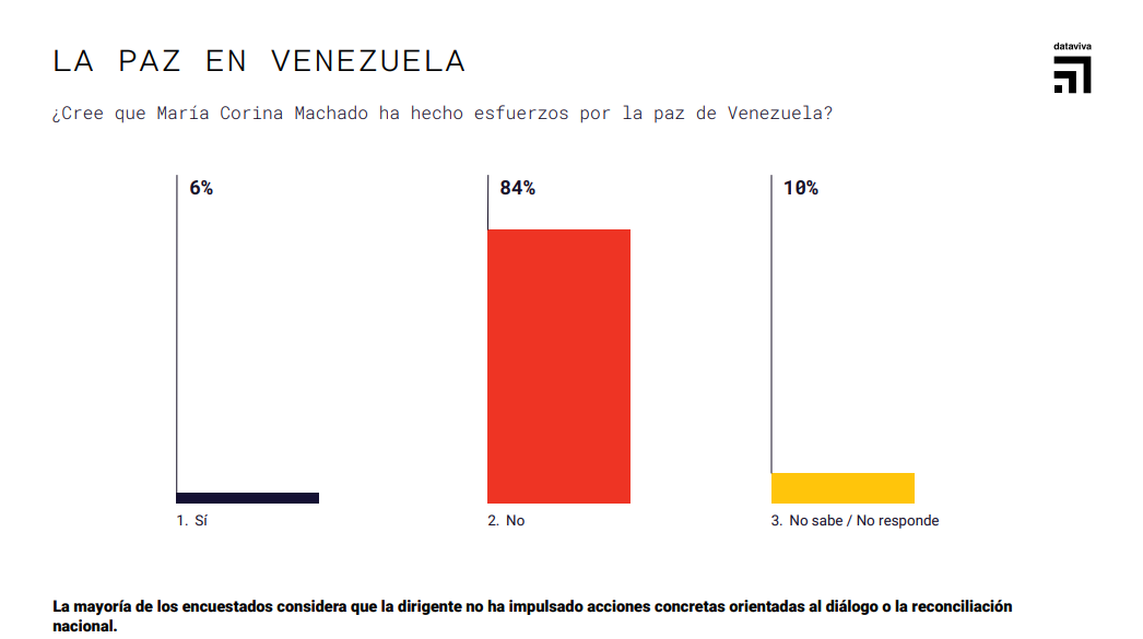 La encuesta también muestra que el 84% considera que María Corina Machado no ha hecho esfuerzos reales por la paz de Venezuela , mientras que el 89% mantiene una opinión desfavorable sobre su liderazgo político , reforzando una tendencia sostenida de desaprobación pública.