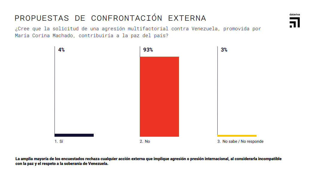 Asimismo, el 93% rechaza de manera categórica cualquier solicitud o propuesta de agresión multifactorial contra Venezuela , al considerarla contraria a la paz, el diálogo y la independencia del país.