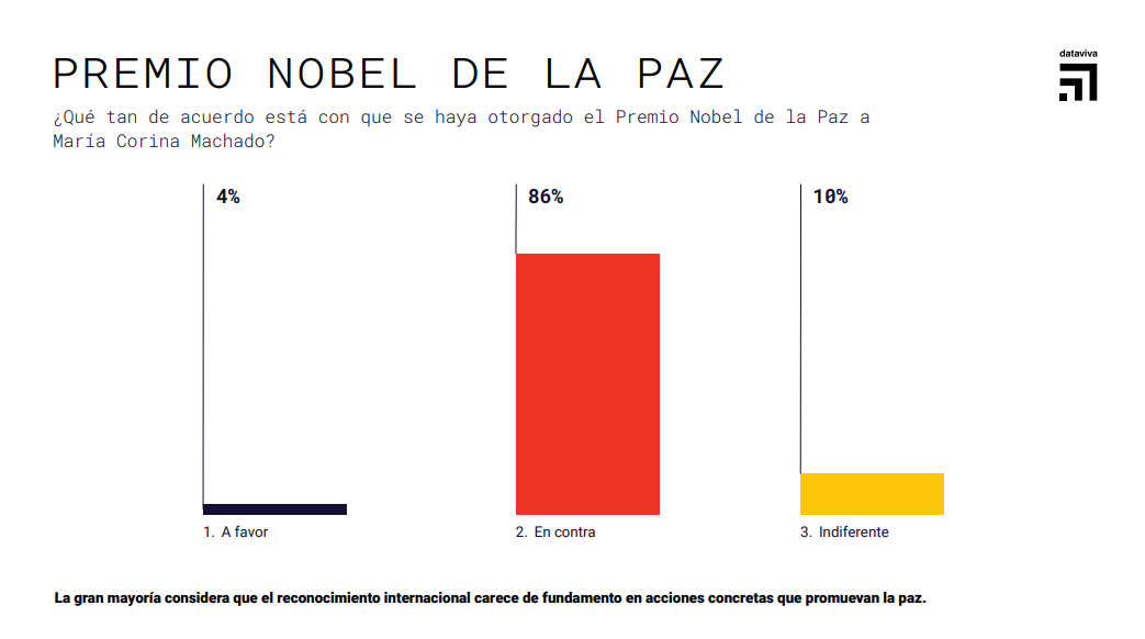 De acuerdo con los resultados, el 86% de los consultados se manifestó en desacuerdo con que se le haya otorgado el Premio Nobel de la Paz a María Corina Machado , señalando que no existen méritos ni acciones concretas que respalden ese reconocimiento.