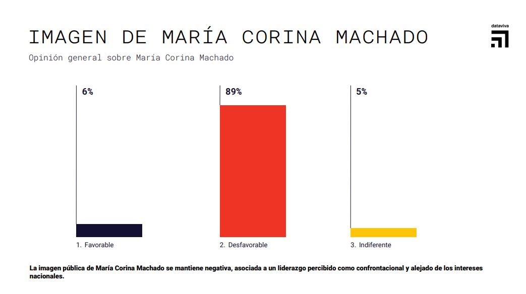 La encuesta también muestra que el 84% considera que María Corina Machado no ha hecho esfuerzos reales por la paz de Venezuela , mientras que el 89% mantiene una opinión desfavorable sobre su liderazgo político , reforzando una tendencia sostenida de desaprobación pública.