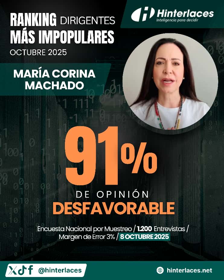 La encuestadora Hinterlaces realizó el pasado 8 de octubre de 2025 un estudio de la percepción de los venezolanos sobre los dirigentes políticos nacionales en el que el 91% de los consultados tiene una opinión desfavorable sobre la dirigente opositora María Corina Machado.