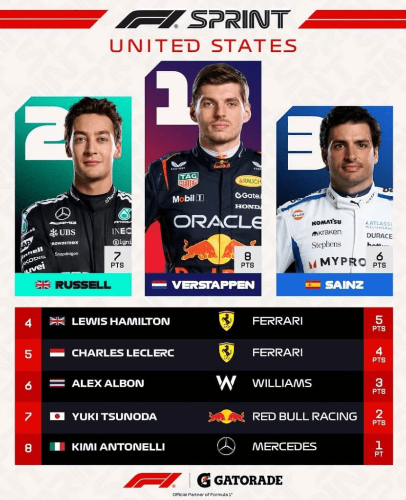La suerte que tiene los papaya es que se trataba del Sprint, con 8 puntos al ganador, todos para Max Verstappen que se queda ahora a 55 de Oscar y a 33 de Lando, con 166 por jugarse (seis carreras completas y dos Sprint más). El holandés soportó un ataque despiadado (e imposible de Russsell) pero salió victorioso.