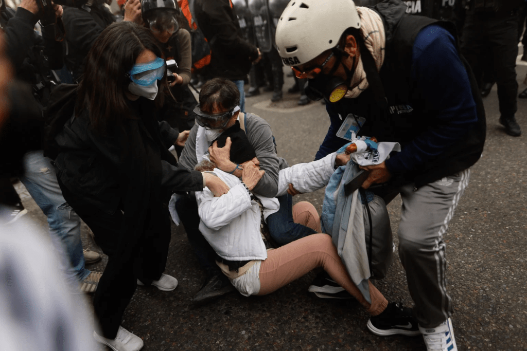 «Como siempre, intentábamos dar la vuelta y me agarraron entre cuatro gendarmes, me patean la espalda, me pegaron los federales también», declaró Víctor, un jubilado, a la televisora local, C5N, desde el interior de un vehículo policial, antes de ser trasladado. Su testimonio fue respaldado por el de otros manifestantes. «Venimos porque ganamos 300 lucas [apróximadamente 200 dólares] y no tenemos ni para los remedios», expresó Eduardo, otro asistente a la marcha, quien denunció que las fuerzas de seguridad les lanzaron gas «directo a la cara».